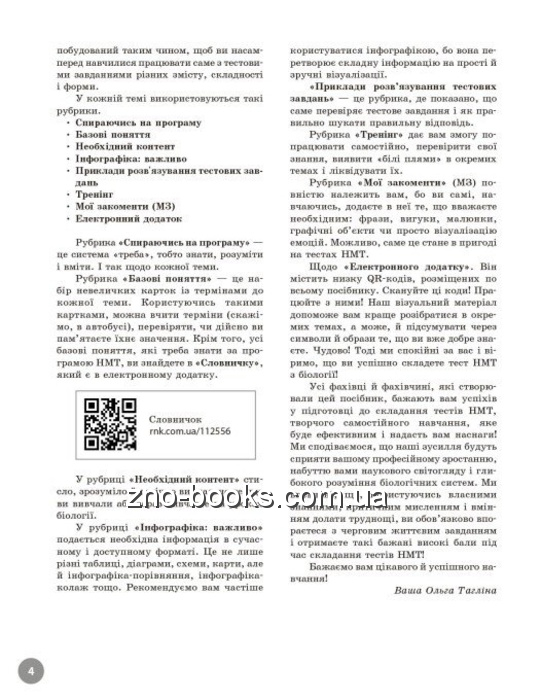 Видання створено з метою якісної та ефективної підготовки до складання НМТ з біології. У довіднику подається теоретичний матеріал, вправи, тести до кожної теми, а також тренувальні тести. За цим посібником учні та учениці можуть готуватись як самостійно, так і на шкільних уроках або заняттях із репетитором.