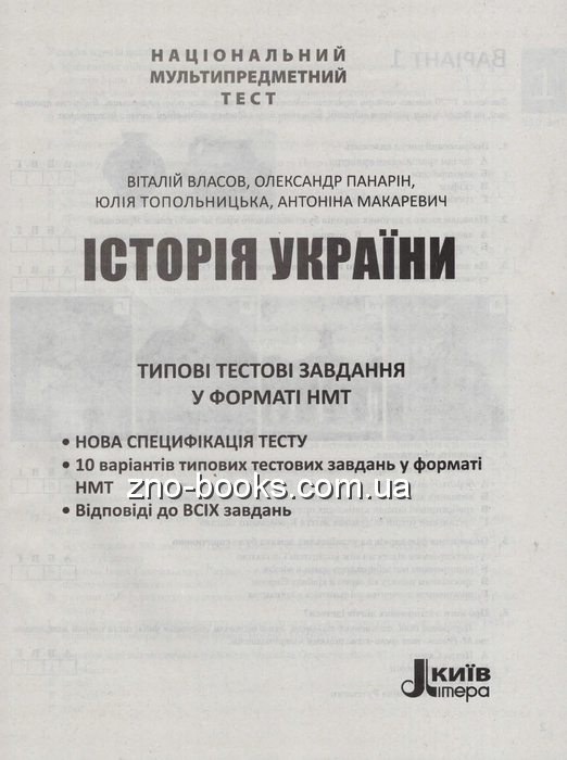 Посібник містить тренувальні завдання, які допоможуть випускникам загальноосвітніх навчальних закладів на високому рівні підготуватися до НМТ ( національний мультипредметний тест ) з історії України. Збірник містить 8 варіантів тестових завдань, розроблених за специфікацією НМТ з історії України УЦОЯО.